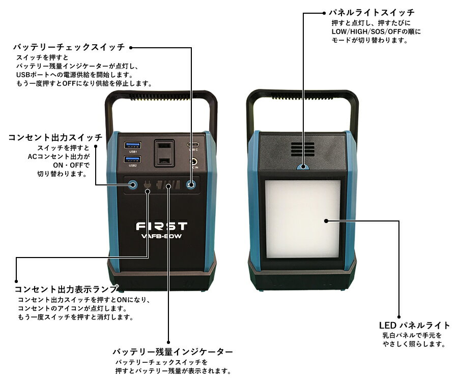 FIRST ソーラーパネル付 ポータブルバッテリー 商品の特徴 ●遊びにも、防災にも!小型・軽量で持ち運びしやすく簡単操作ですぐに使えるポータブル電源。