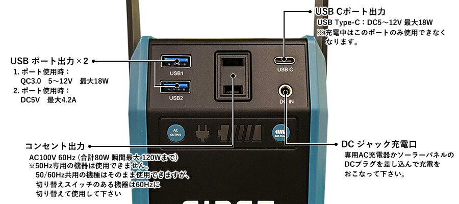 製品仕様 ポータブルバッテリー 本体サイズ W95mm×D70.2mm×H181mm 製品重量 856g 内蔵バッテリー リチウムイオンバッテリー22,500mAh 3.7V 83Wh(最大) 充電時間 約6時間(専用AC充電器) 作業環境温度 −10℃〜+40℃ USB出力 USBコネクタ1個使用時:QC3.0DC5/9V最大18W2個使用時:DC5V合計4.2Aまで UBSCコネクタDC5〜12V最大18W AC出力 AC100V 60Hz 1個口(80W瞬間最大120Wまで) 出力波形 矩形波(疑似正弦波) バッテリー寿命 約500回 付属品 ・専用AC充電器・シガープラグアダプター・取扱説明書 ソーラーパネル 仕様パネル 多結晶ポリクリスタルライン 公称最大出力 (Pm) 10W 公称解放電圧 (Voc) 18.8V 公称最大出力動作電圧 (Vpm) 15V 公称短絡電流 (Isc) 0.71A 公称最大出力動作電流 (Ipm) 0.67A 出力 DC18V1.67A サイズ W343mm×D18mm×H283mm 重量 約1100g 電源コード 2mDCコネクター3.5Φ×1.35mm 関連商品 画像をクリックで 商品ページへ移動 型式 VAFB-80W VAFB-420 VAFB-420-SET BA-SP40W 内臓バッテリー 22,500mAh/3.7V/83Wh 42,000mAh/3.7V/155Wh 42,000mAh/3.7V/155Wh - 充電時間(AC) 7〜8時間 6時間 6時間 - 重量(本体のみ) 856g 1,720g 1,720g 1,900g LEDライト 1 2 2 - ACコンセント 1 2 2 - USB QC3.0(クイック) 2 1 1 - USB type-b - 2 2 - USB type-c 1 1 1 - DCジャック - 2 2 - その他 ソーラーパネル標準装備 - ソーラーパネル付 各変換プラグ付