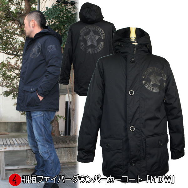 【最大P26倍】和柄 ファイバー ダウン パーカー ロング コート「MDW」mibudo original biker style ブラック中綿 長袖 送料無料 メンズ レディース 手染 京都