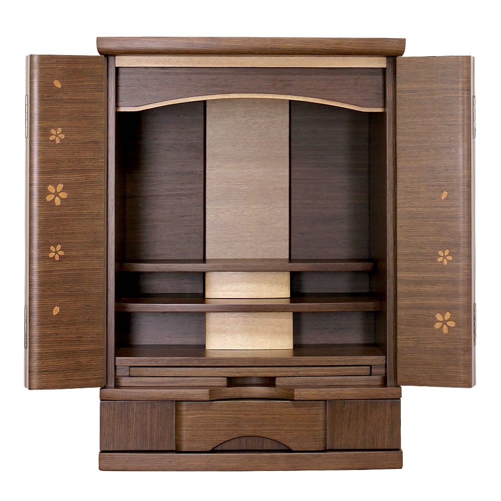 さらに、本尊の背板や欄間は、それぞれサクラとウォールナットの異なる木材を使用しカラーがツートンカラーとなり非常に映えて高級感が出るように仕上げています。